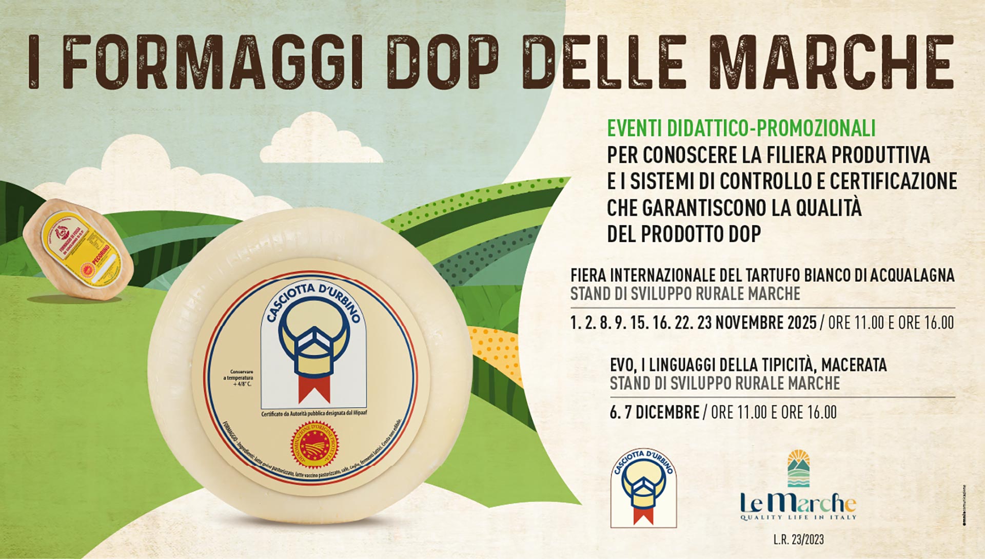 La “Casciotta d’Urbino DOP” è prodotta nel territorio della provincia di Pesaro-Urbino e in alcuni comuni della provincia di Rimini (Novafeltria, Talamello, Sant’Agata Feltria, Casteldelci, Maiolo, San Leo, Pennabilli) secondo tecniche casearie di radici antiche, consolidate nei secoli, rigidamente regolamentate.